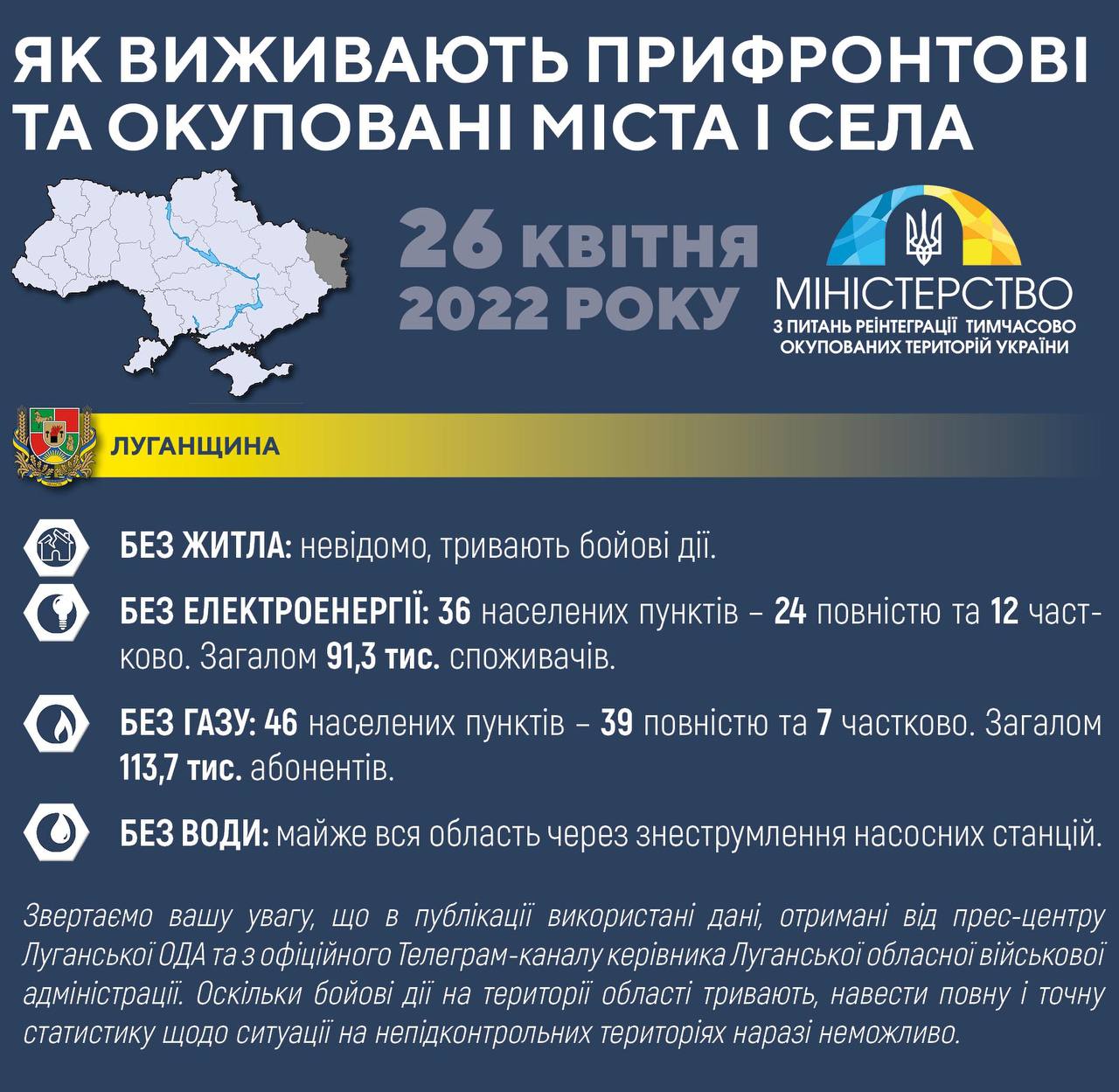 Звертаємо вашу увагу, що в публікації використані дані, отримані від прес-центру Луганської ОДА та з офіційного Телеграм-каналу керівника Луганської обласної військової адміністрації. Оскільки бойові дії на території області тривають, навести повну і точну статистику щодо ситуації на непідконтрольних територіях наразі неможливо.