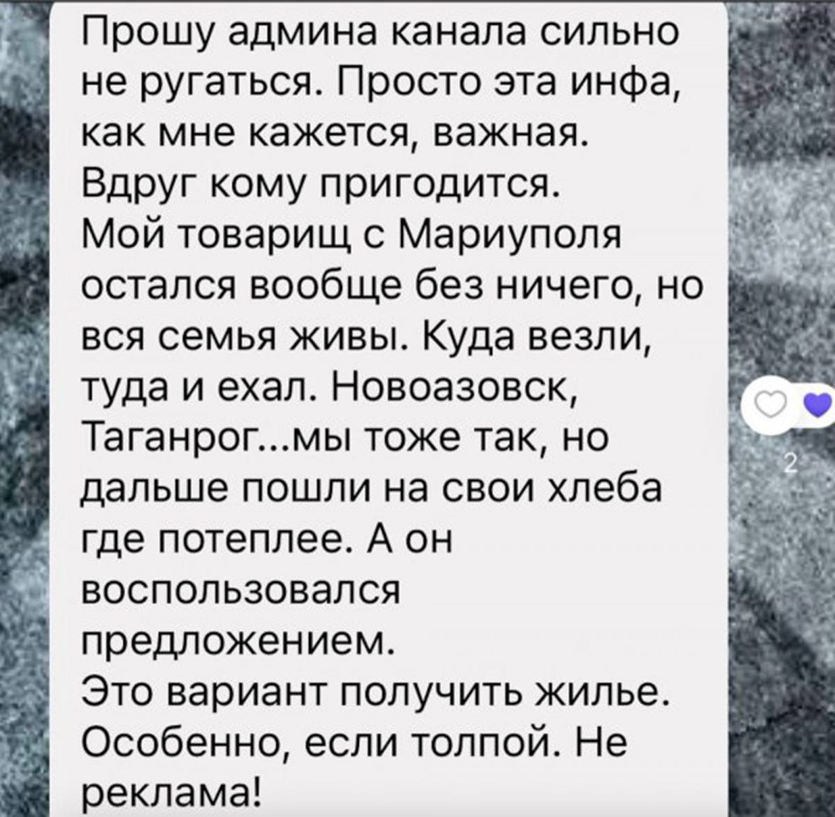 На його думку, московити намагаються змусити маріупольців «добровільно» полишити курортне місце заради постійних холодів і відсутності благ цивілізацій. Та все це є ворожою «інформаційною пасткою» і відвертою брехнею. У такий спосіб українців хочуть підштовхнути до обрання під час депортації з усіх регіонів росії саме далекий схід, де не вистачає робочих рук.