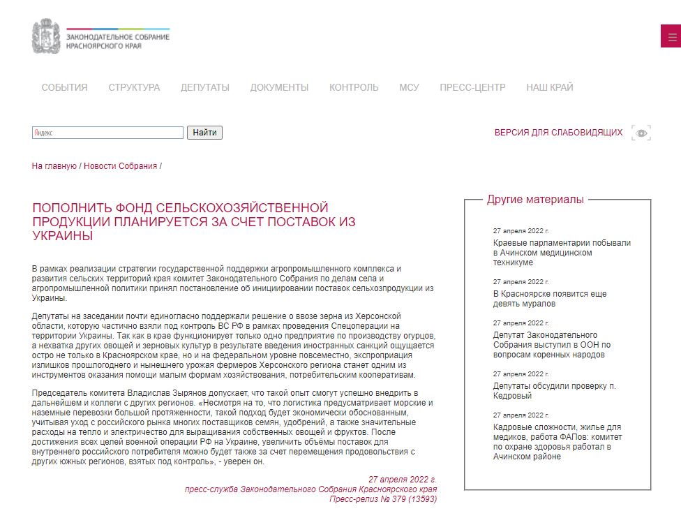 У документі від красноярських «законодатєлєй» зазначається, що «Оскільки в краї функціонує тільки одне підприємство з виробництва огірків, а нестача інших овочів та зернових культур внаслідок запровадження іноземних санкцій відчувається гостро не лише у Красноярському краї, а й на федеральному рівні повсюдно, експропріація надлишків минулорічного та нинішнього врожаю фермерів Херсонського регіону стане одним із інструментів надання допомоги малим формам господарювання».