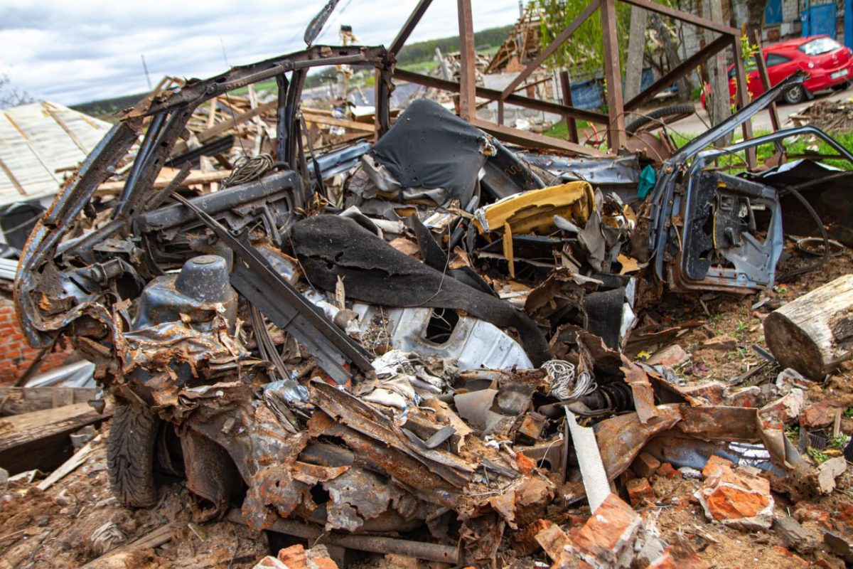 Будинку навпроти пощастило більше — відсутній лише дах. Хоча складно щось говорити, не побачивши його зсередини. Біля хати залишки ще одного автомобіля.