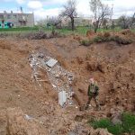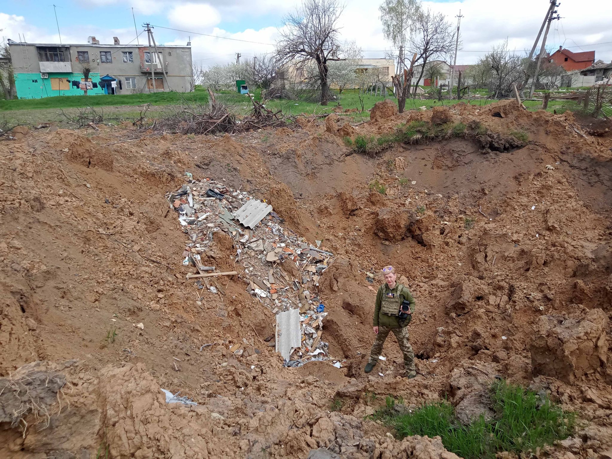 Олександр веде нас через дорогу до будинку сусідів. Точніше, до того, що від нього залишилося. Бачимо руїни, які поховали під собою двох господарів. Поряд — воронка від авіабомби глибиною кілька метрів, у якій вигорілий скелет автівки. Олександр розповідає, що тіла його сусідки рятівники так і не знайшли, але специфічний запах, який присутній поблизу будинку, вказує, що її могила десь тут…