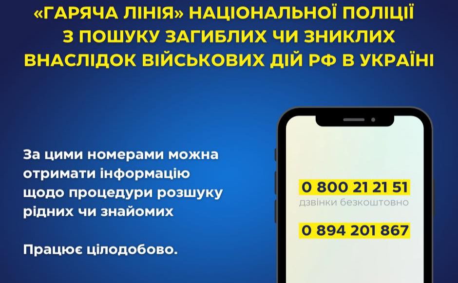 Нагадаємо, на початку квітня Національна поліція відкрила «гарячу лінію» для родичів загиблих унаслідок військових дій рф. Лінія працює цілодобово за номером 0 894 201 867.