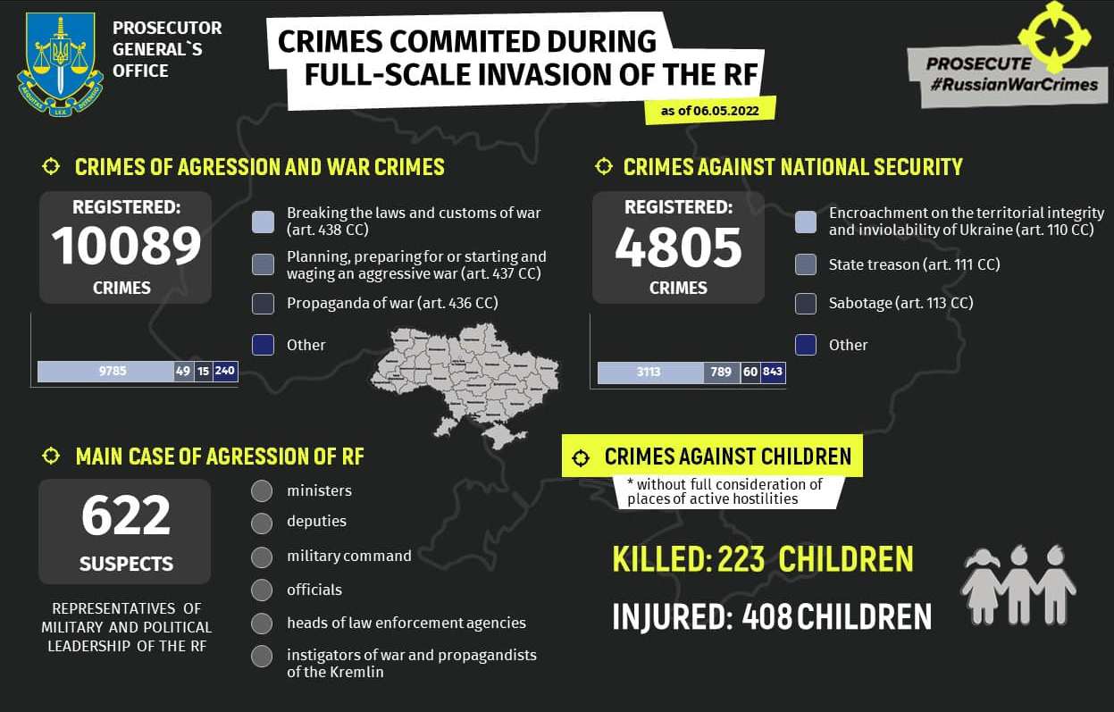 «Станом на 6 травня задокументовано 10089 воєнних злочинів та 4805 злочинів проти національної безпеки України. Внаслідок збройної агресії за офіційними даними ювенальних прокурорів 641 дитина постраждала в Україні внаслідок збройного вторгнення рф в нашу державу. При цьому 223 дитини загинуло та 408 отримали поранення», — повідомляють в Офісі Генерального прокурора.