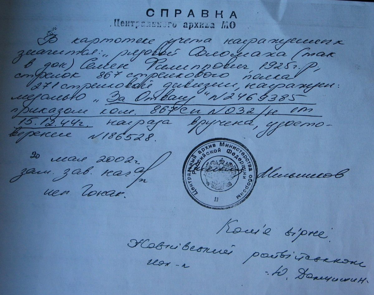 Поки рядовий Саламаха добирався до свого полку, туди вже повідомили про його здобич. Як виявилось, дуже важливу. Командир роти привітав солдата і сказав, що його представлять до нагороди. Проте вручили її майже за шістдесят років після Перемоги.