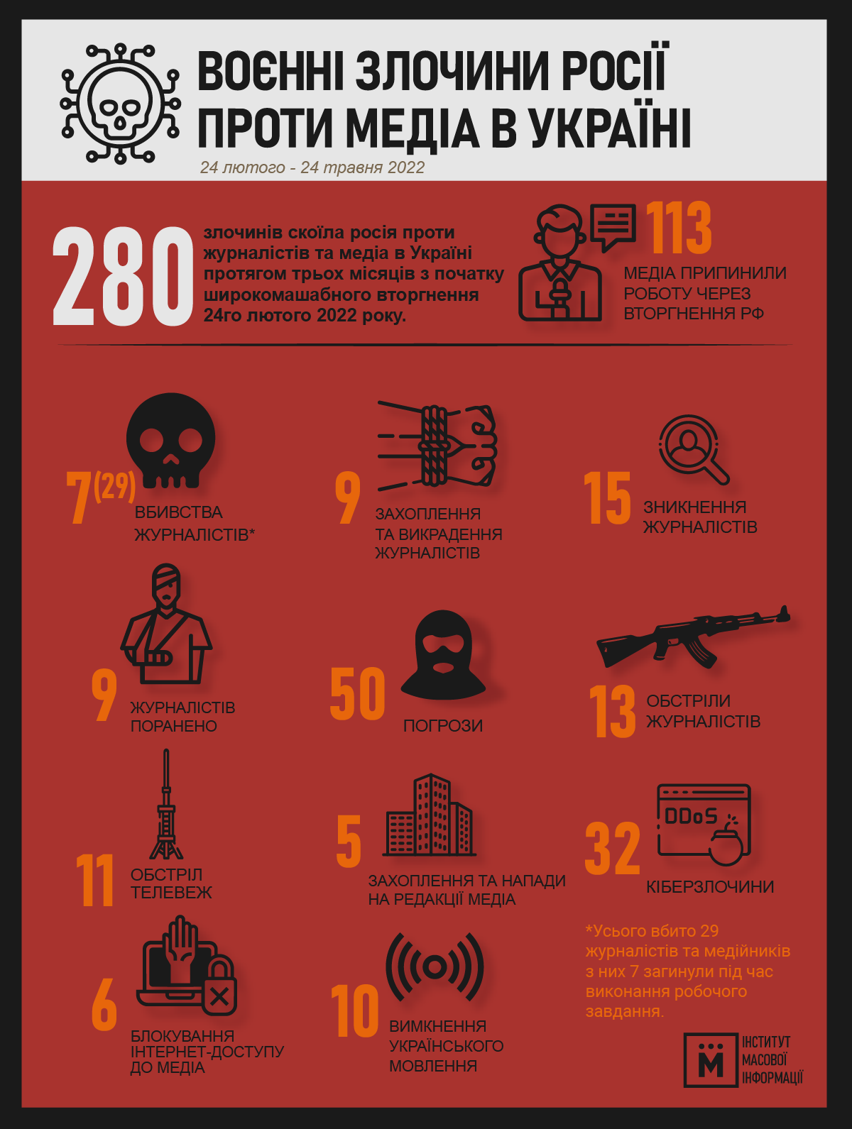 Станом на 25 травня загалом росіяни вбили 29 журналістів, з них сім журналістів убито під час виконання професійних обов’язків. Дев’ять журналістів були поранені, і щонайменше 15 журналістів зникли безвісти. Зокрема, журналіст Дмитро Хилюк зник на Київщині під час російської окупації. Хоча цю територію з березня вже звільнено, ІМІ досі не вдалося його знайти.