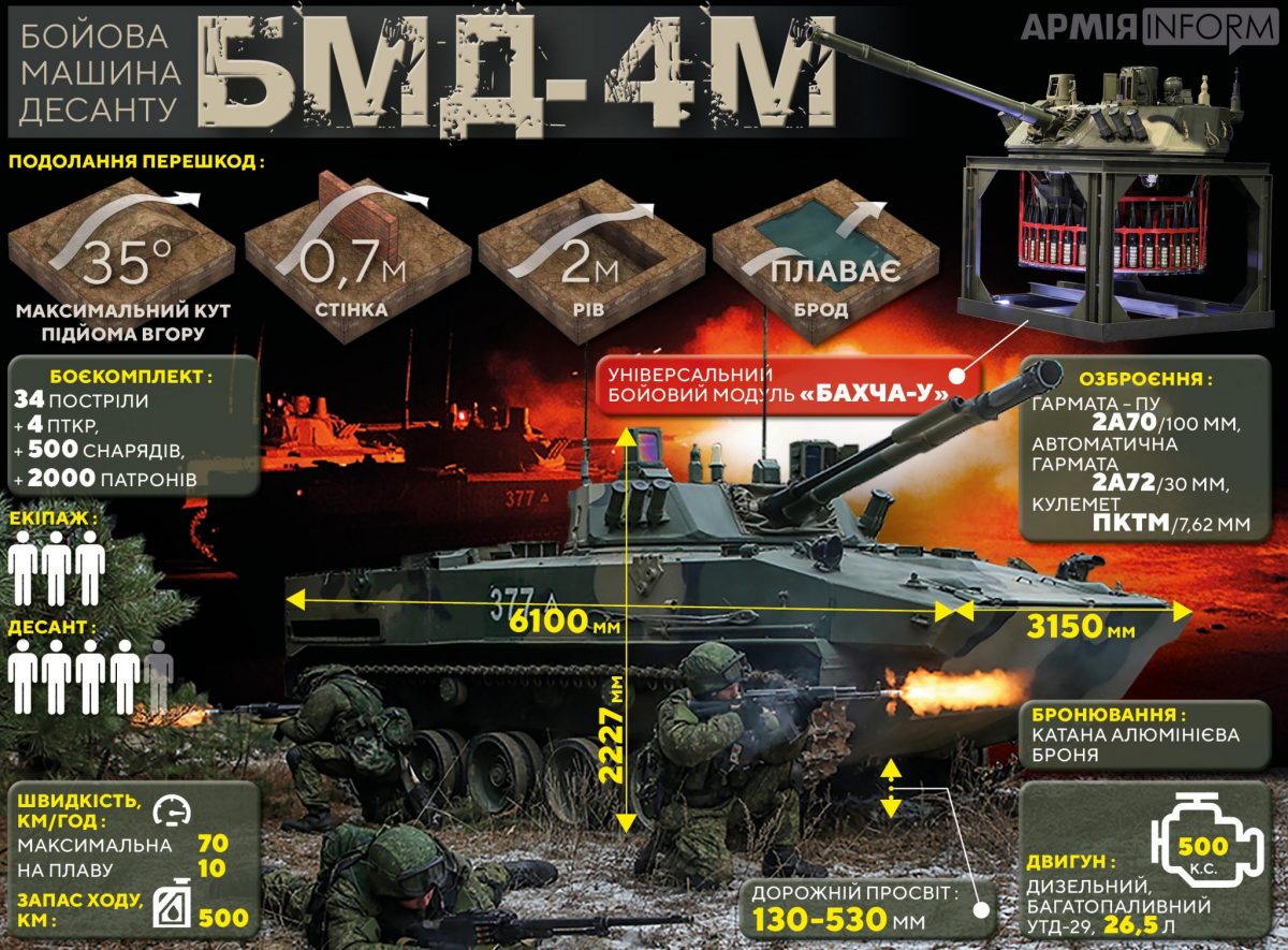 Бойову машину десанту БМД-4М прийняли на озброєння у 2016 році. Це плаваюча машина на гусеничному ходу, яка може десантуватися парашутним та посадковим способом як з особовим складом усередині, так і без нього. Зберегла загальну схему компонування БМД-4 з розташуванням відділення управління в носовій частині машини, бойовим та десантним відділеннями в середній частині корпусу та в башті, а також моторно-трансмісійним відділенням у кормовій частині.