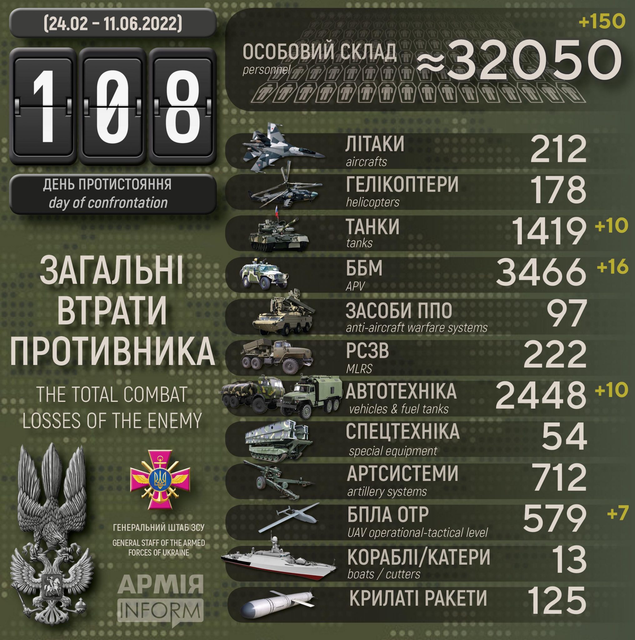 Загальні бойові втрати противника з 24.02 по 11.06 орієнтовно склали: