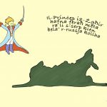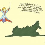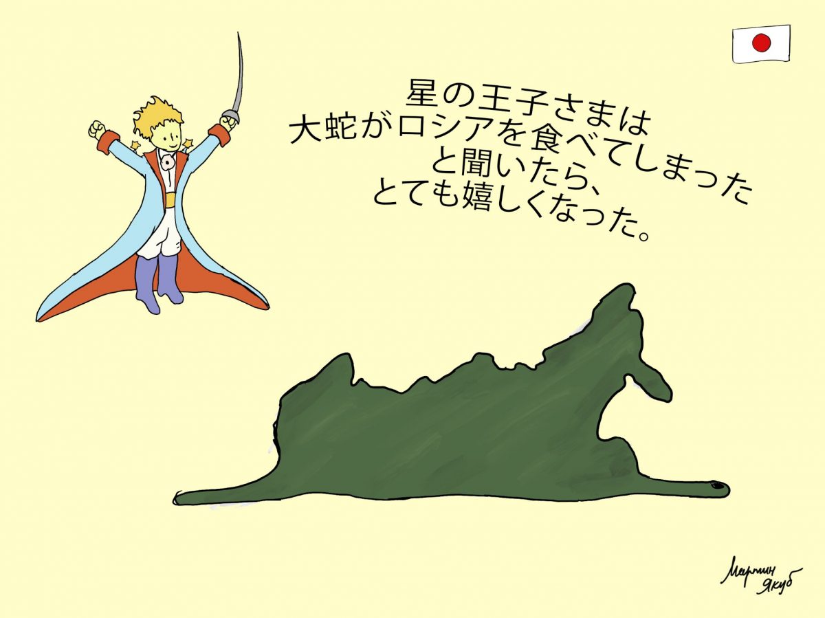 − Тоді кілька слів про інші роботи, підписи до яких якраз перекладалися іноземними мовами. Здається, найбільшу кількість перекладів має робота «Маленький принц дуже зрадів, коли дізнався, що удав проковтнув росію».