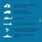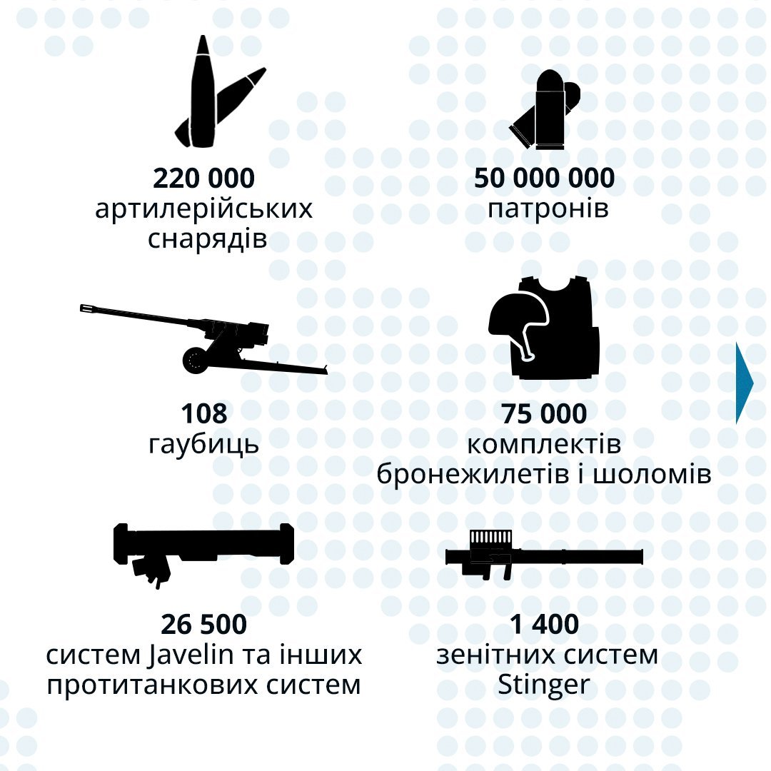 Зокрема, безпекова допомога США включає високомобільні артилерійські ракетні системи, декілька сотень броньованих багатоцільових машин, гелікоптери, безпілотні повітряні системи, контрбатарейні, контрмінометні та повітряні оглядові радари, безпілотні судна берегової оборони.