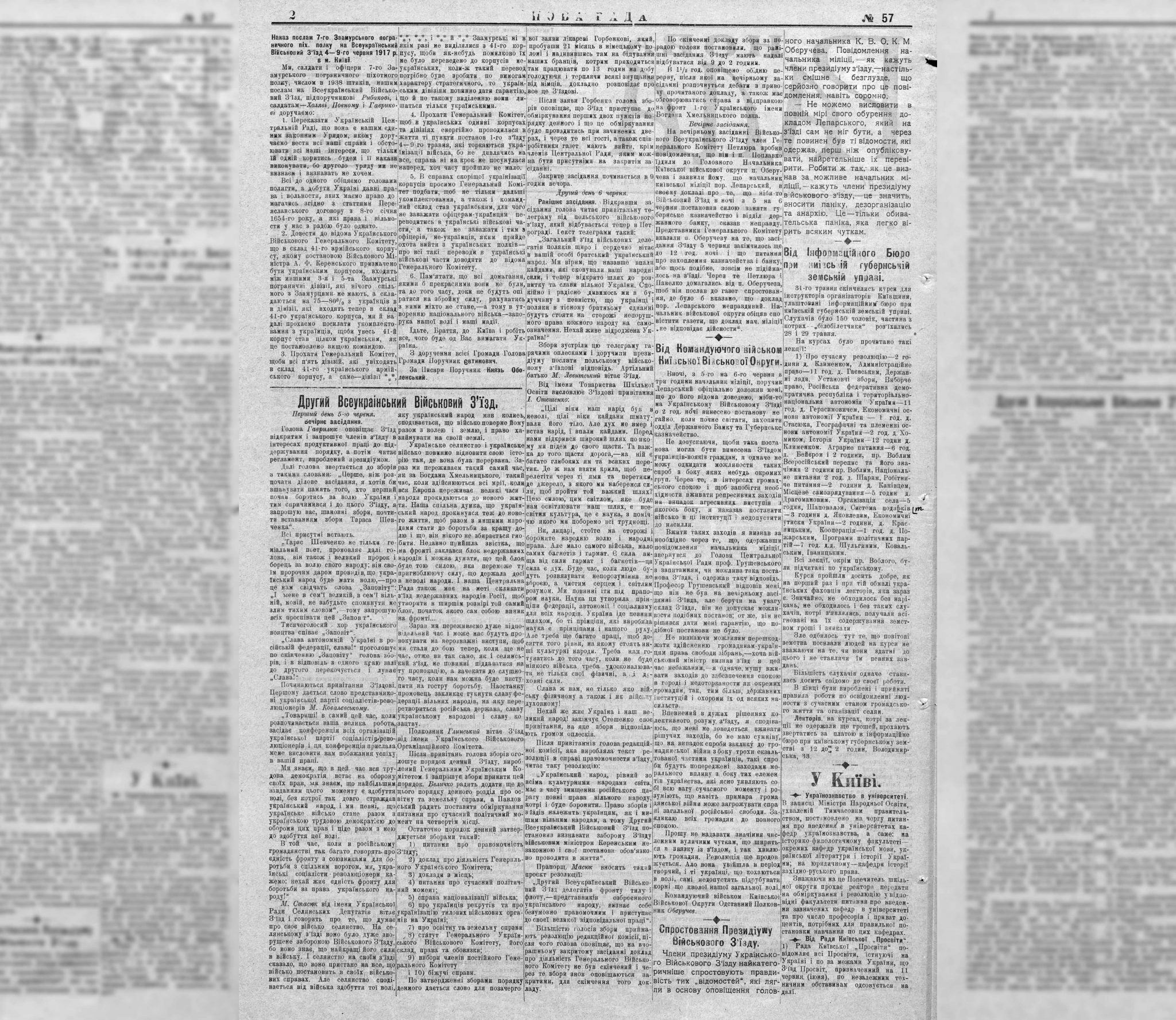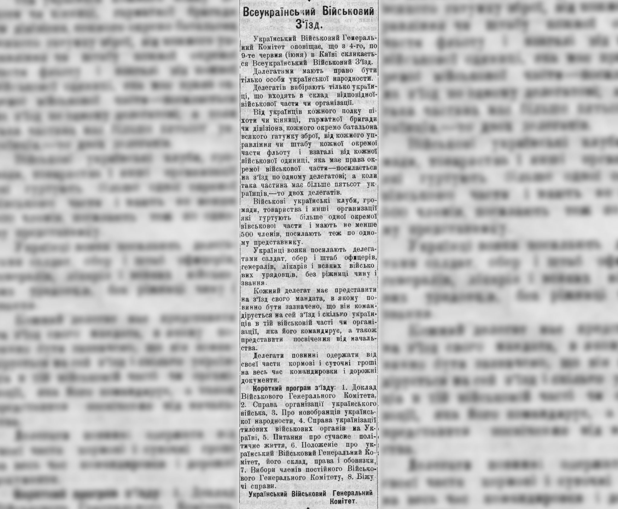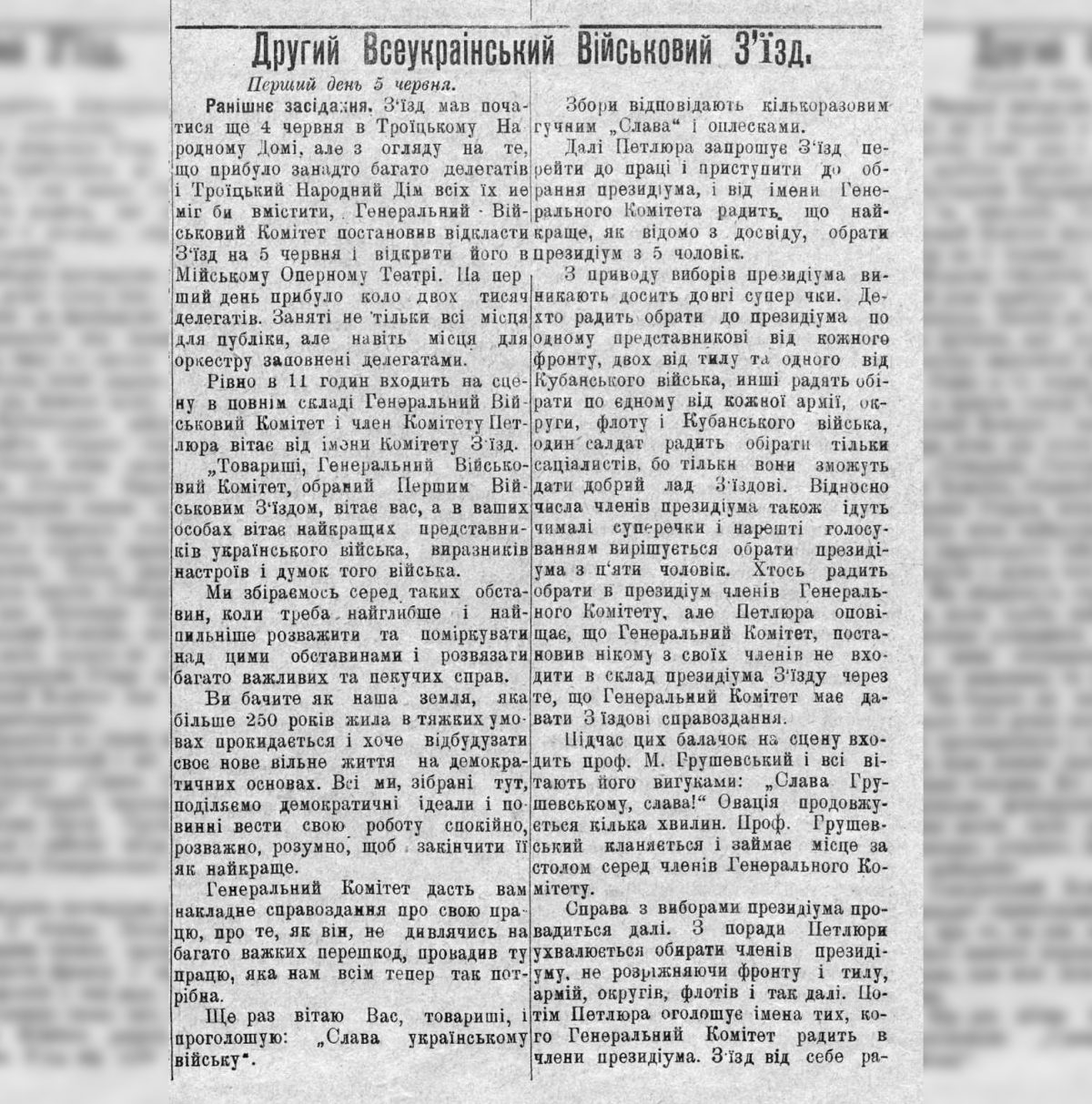 18 червня (або 5 червня за старим стилем) 1917 року в Києві розпочав роботу II Всеукраїнський військовий з’їзд. Понад 2 тис. 300 делегатів з’їзду представили на ньому близько 2 млн українських вояків.