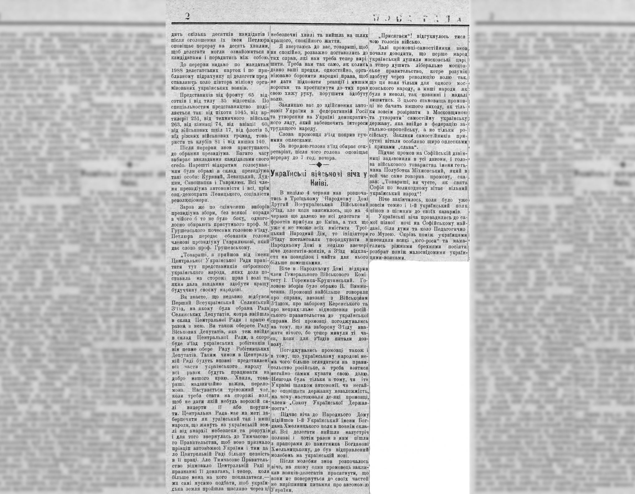 «Товариші, я прийшов від імені Центральної Української Ради привітати тут представників озброєного українського народа, яких доля поставила на сторожі прав і волі та яким дала завдання здобути кращу будуччину своєму народу», − такими словами розпочав Михайло Грушевський своє звернення до українських військових.