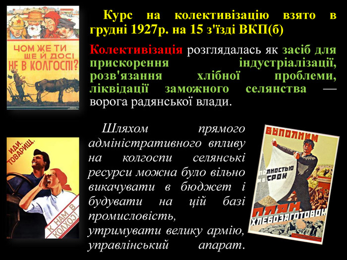 Така практика була і у колишньому СРСР. Тоді на основі селянських дворів примусово створювали великі колективні господарства. Передбачалося, що результатом колективізації стане ріст виробництва сільськогосподарської продукції на 150 %. Колективізація мала ліквідувати «шкідливий буржуазний вплив» приватної власності.