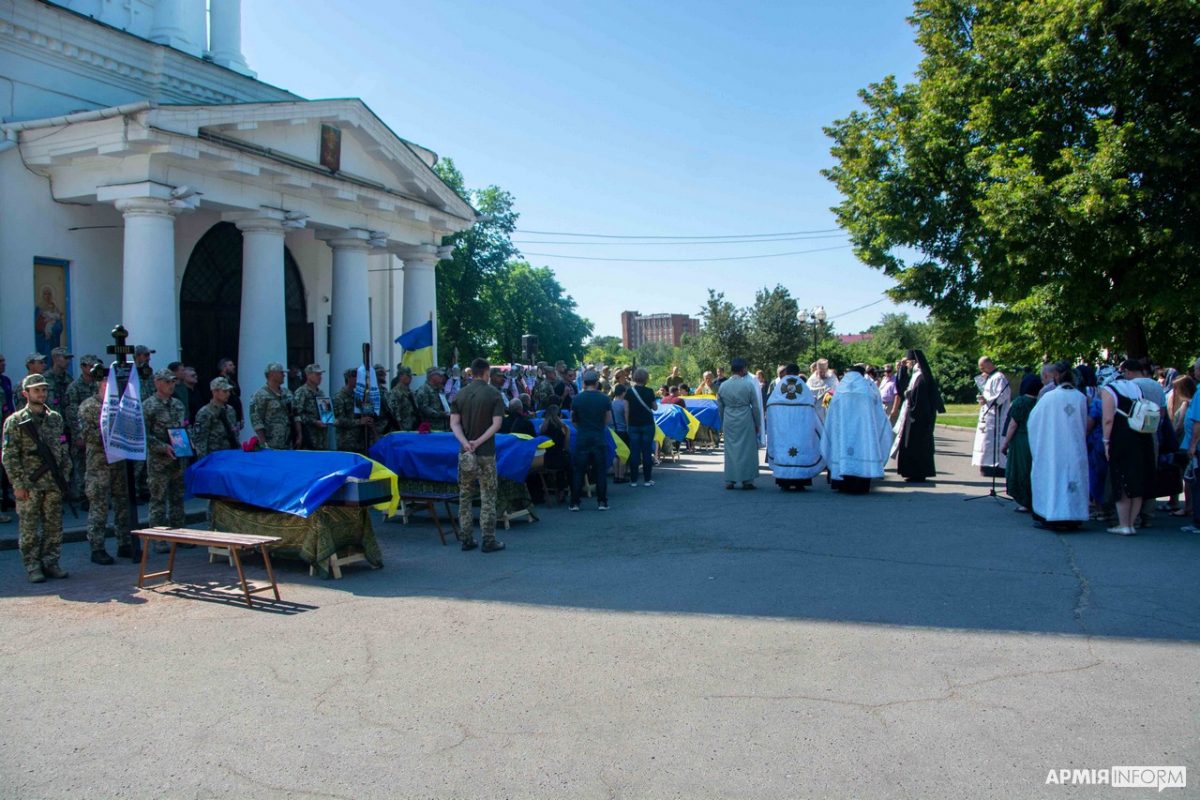 Сьогодні полтавці та військові зібралися біля Свято-Успенського собору, аби попрощатися з сімома українськими захисниками, які загинули під час важких боїв із російськими окупантами.