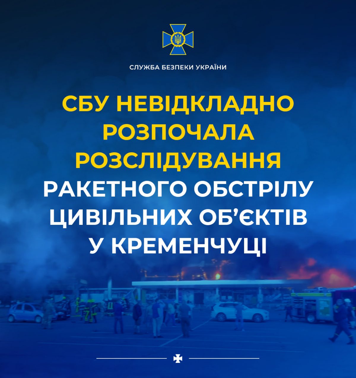 СБУ невідкладно розпочала розслідування чергового воєнного злочину окупантів – ракетного обстрілу цивільних об’єктів у Кременчуці.