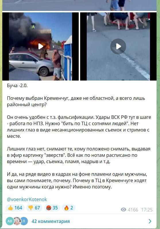 «Вбивці миттєво розповсюджують брехню, що ракети по ТРЦ це спланований удар ЗСУ. Світ їм давно не вірить, але російське стадо вимушено вірити, адже визнати правду – що росіяни криваві вбивці і терористи номер один – для них просто неможливо. Справді, можна збожеволіти».