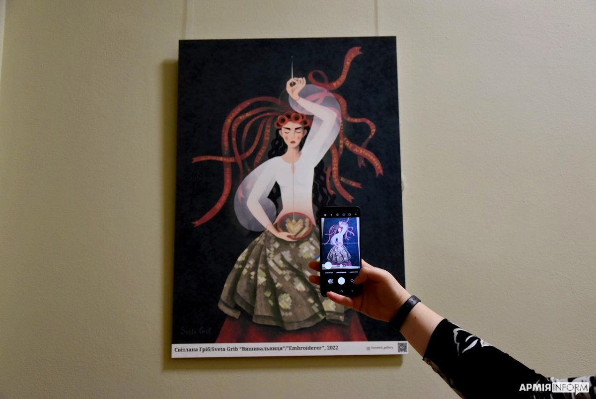 Українські митці у своїх роботах креативно зобразили стійкість українського народу у російсько-українській війні. Одна з авторів представлених робіт Світлана Гріб презентувала картину «Вишивальниця». Авторка зобразила українську дівчину, яка вишиває військову форму пікселем у вигляді квітів. На думку Світлани Гриб, це більше ніж форма, це талісман. На заплетених у волосся дівчини стрічках написані слова українських народних пісень, які додають сили нашим воїнам.
