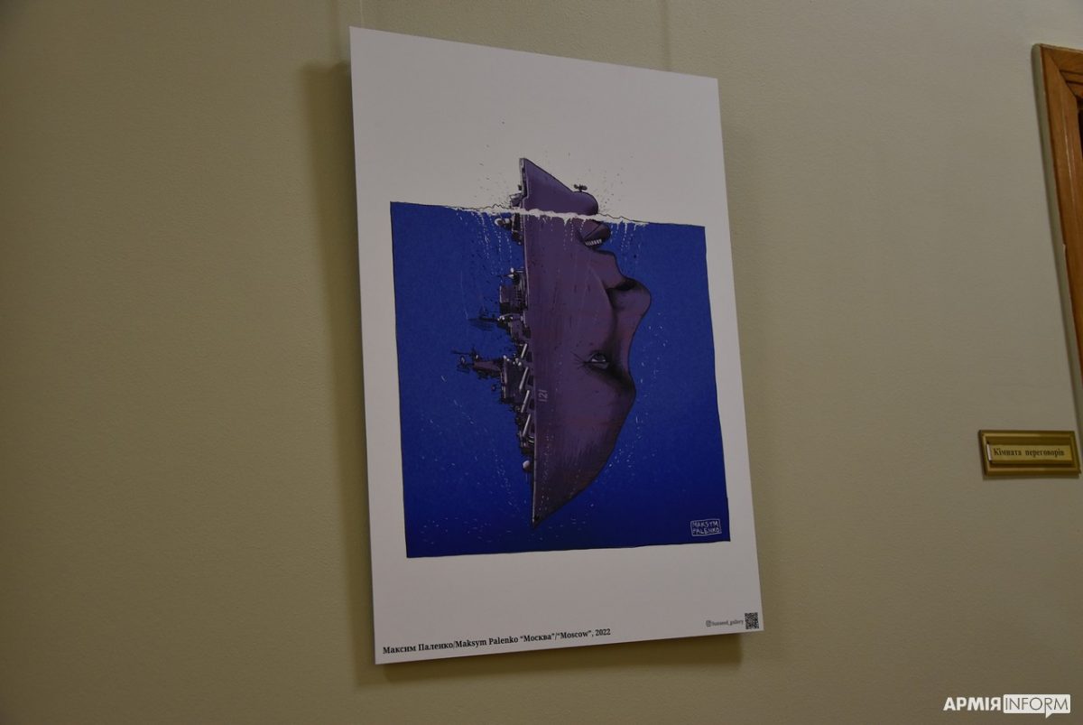 Максим Паленко представив картину під назвою «москва». На ній зображено затонулий крейсер «москва» в формі обличчя путіна. Ця подія символічна в російсько-українській війні, адже знищено не лише військовий корабель, розбиті й плани путіна. Інша москва впаде, це лише питання часу.