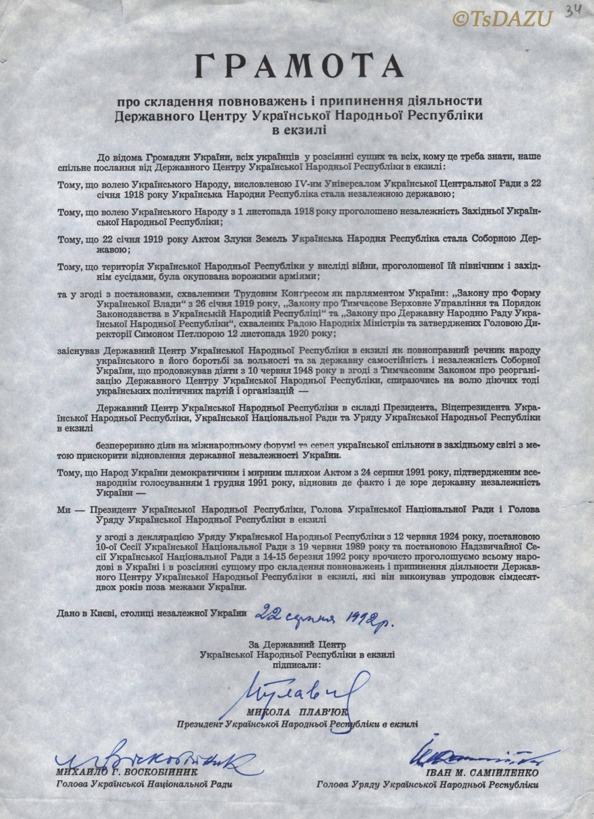Наша держава в 1990-ті цілком вписувалася в російський сценарій, залишаючись інтегрованою в політико-економічний та інформаційний простір рф. Але ще на світанку незалежності, коли урочисто відзначали її першу річницю, припинила існувати ще одна держава — Українська Народна Республіка. 22 серпня 1992 року Президент УНР в екзилі Микола Плав’юк в урочистій обстановці передав повноваження Державного Центру УНР Леонідові Кравчуку. Таким чином сучасна Україна стала правонаступником Української Народної Республіки.