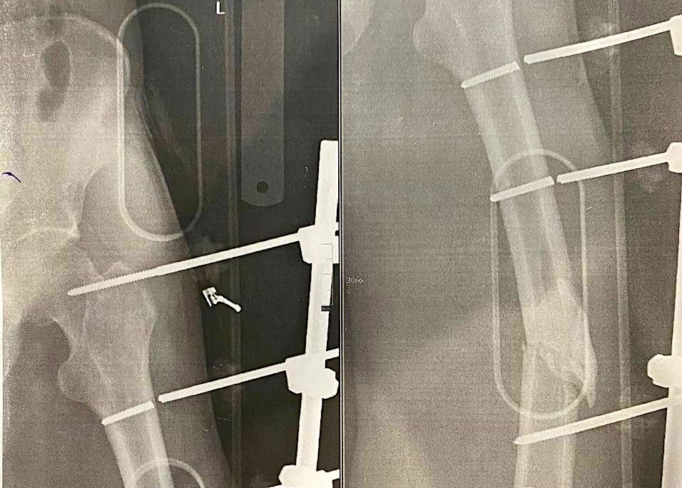 – Він постраждав у березні, захищаючи нашу Батьківщину на передовій, – розповів лікар ортопед-травматолог Дніпропетровської обласної клінічної лікарні імені І. І. Мечникова Максим Макаренков. – На етапах евакуації чоловік переніс близько 19 операцій на кістках та судинах лівої нижньої кінцівки. У червні апарат зовнішньої фіксації (АЗФ) дестабілізувався, порушилась цілісність конструкції. Пацієнту було демонтовано апарат, накладено гіпсову іммобілізацію. А вже після загоєння ран від видалених стрижнів лікарі Центру травматології та Ортопедії лікарні Мечникова виконали пацієнту чергове оперативне втручання.