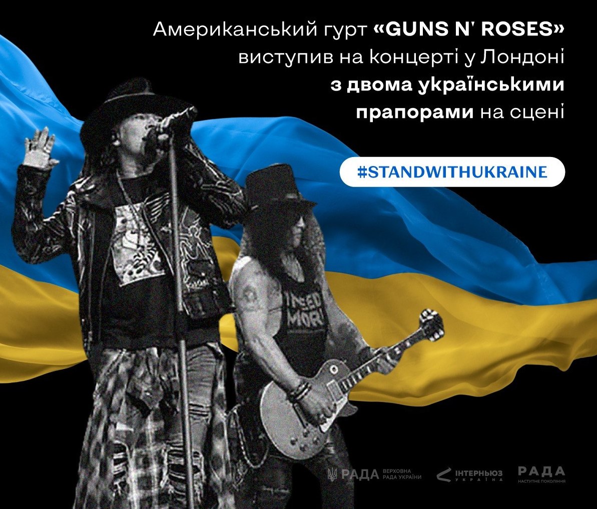 The Rolling Stones на концерті в Гайд-парку в Лондоні розмістили логотип у синьо-жовтих кольорах. А під час виконання пісні «Gimme Shelter» на екранах були сцени вибухів бомб та руйнувань в українських містах. Згодом на табло замайорів великий український стяг. Публіка надзвичайно позитивно відреагувала на символічний жест рокерів.