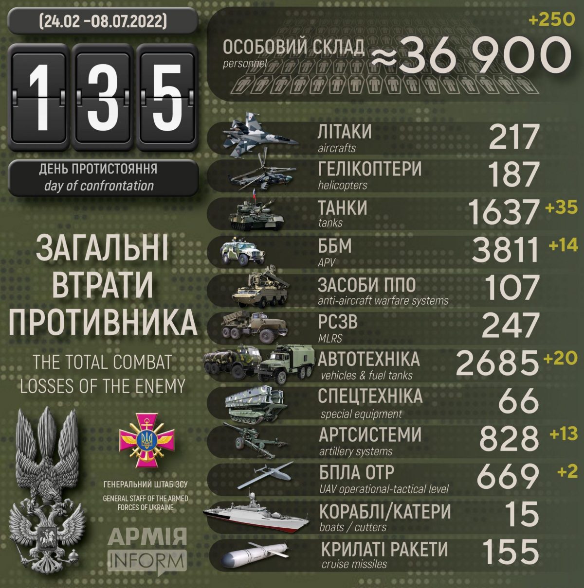 Загальні бойові втрати противника з 24.02 по 08.07 орієнтовно становлять: