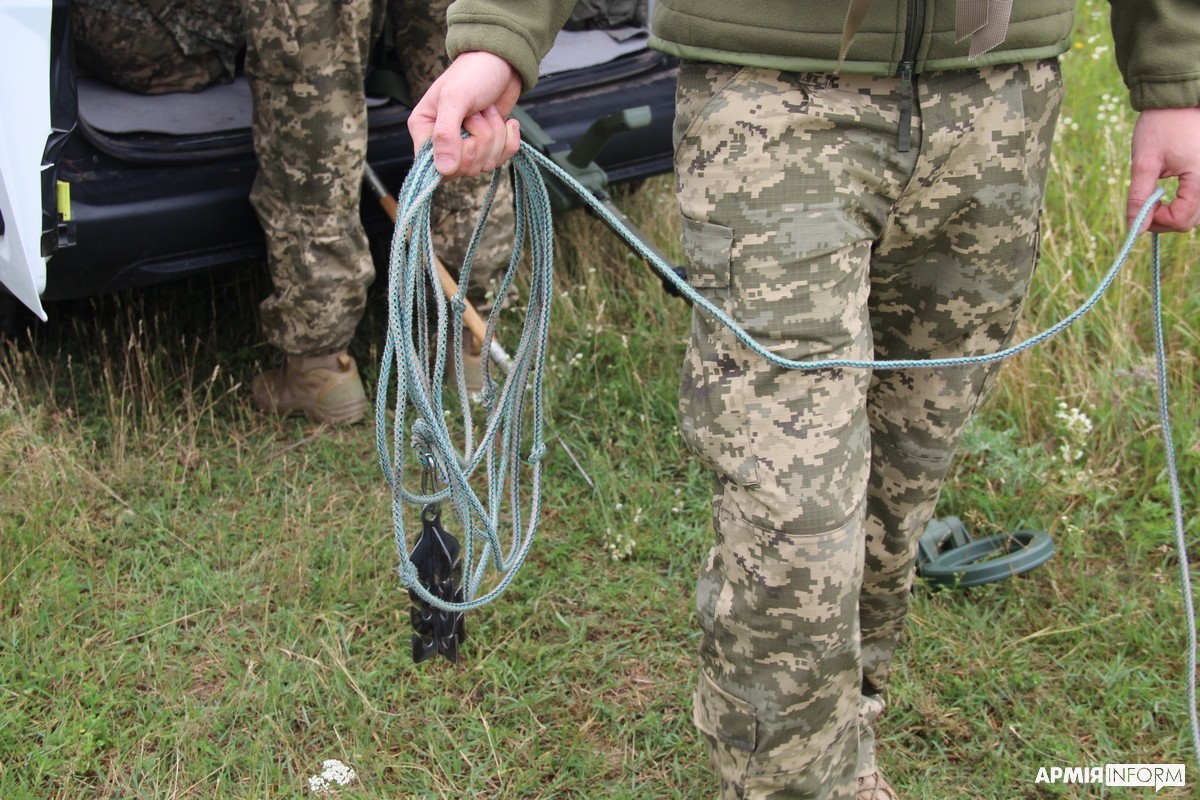 А розпочали роботу воїни, озброєні так званими саперними кішками, багатопалими гаками на довгому мотузку, який кидають на незвіданий напрямок якнайдалі й тягнуть до себе, перевіряючи місцевість на наявність розтяжок. Тим більше, що висока й густа трава дуже добре ховає небезпеку, яку можна виявити, лише протягуючи через траву такий гак.
