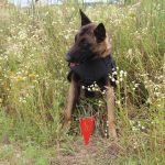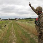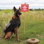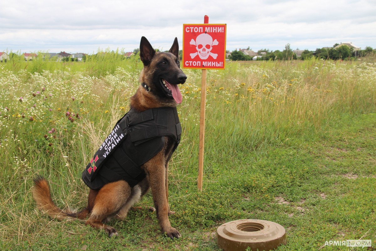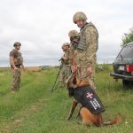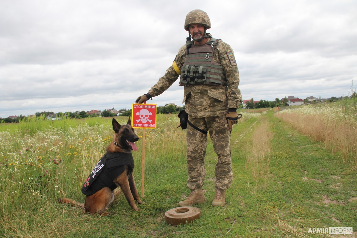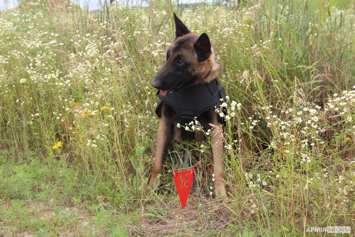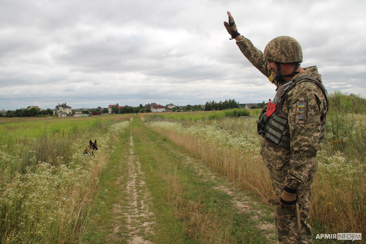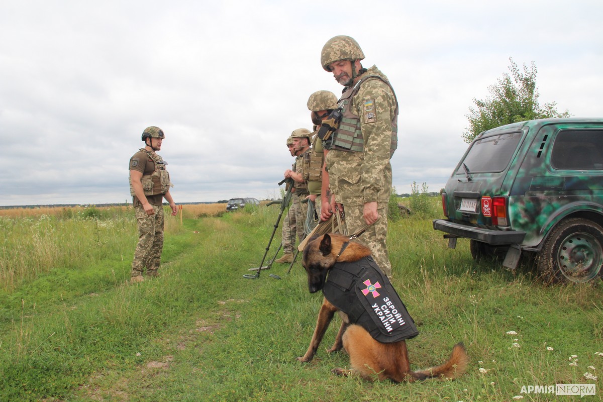 До групи, яка працювала на ділянці також був залучений сапер-кінолог, на ім’я Леонід, із мінно-розшуковим собакою Алмаз. Проте висока трава є несприятливим чинником для повноцінної роботи собаки, тому Леонід з Алмазом перевірили польову дорогу, її узбіччя, майданчик, де зводитиметься церква, й провели невелике тренування.