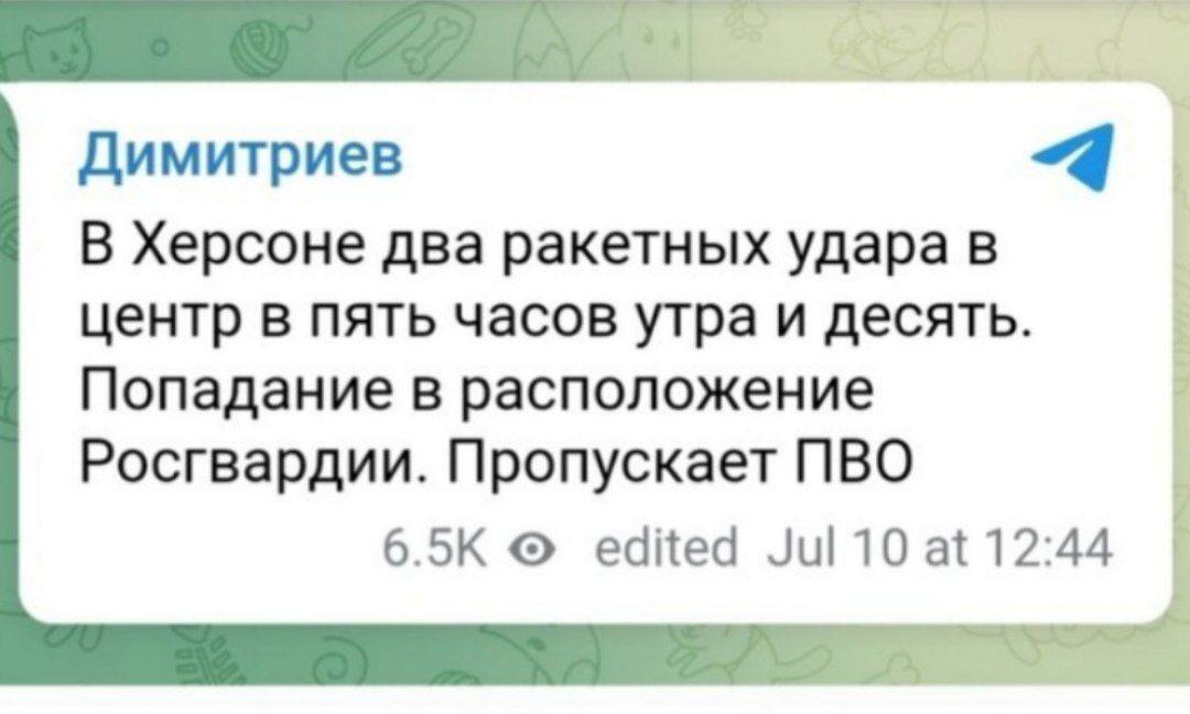 «ЗСУ завдали удару по базі окупантів на Херсонщині. Нині там пожежа і все димить. Орки лютують. Оточили центр міста та перевіряють усіх людей. Пропагандистам теж щось не подобається і вони нарікають на ППО», – повідомив він.