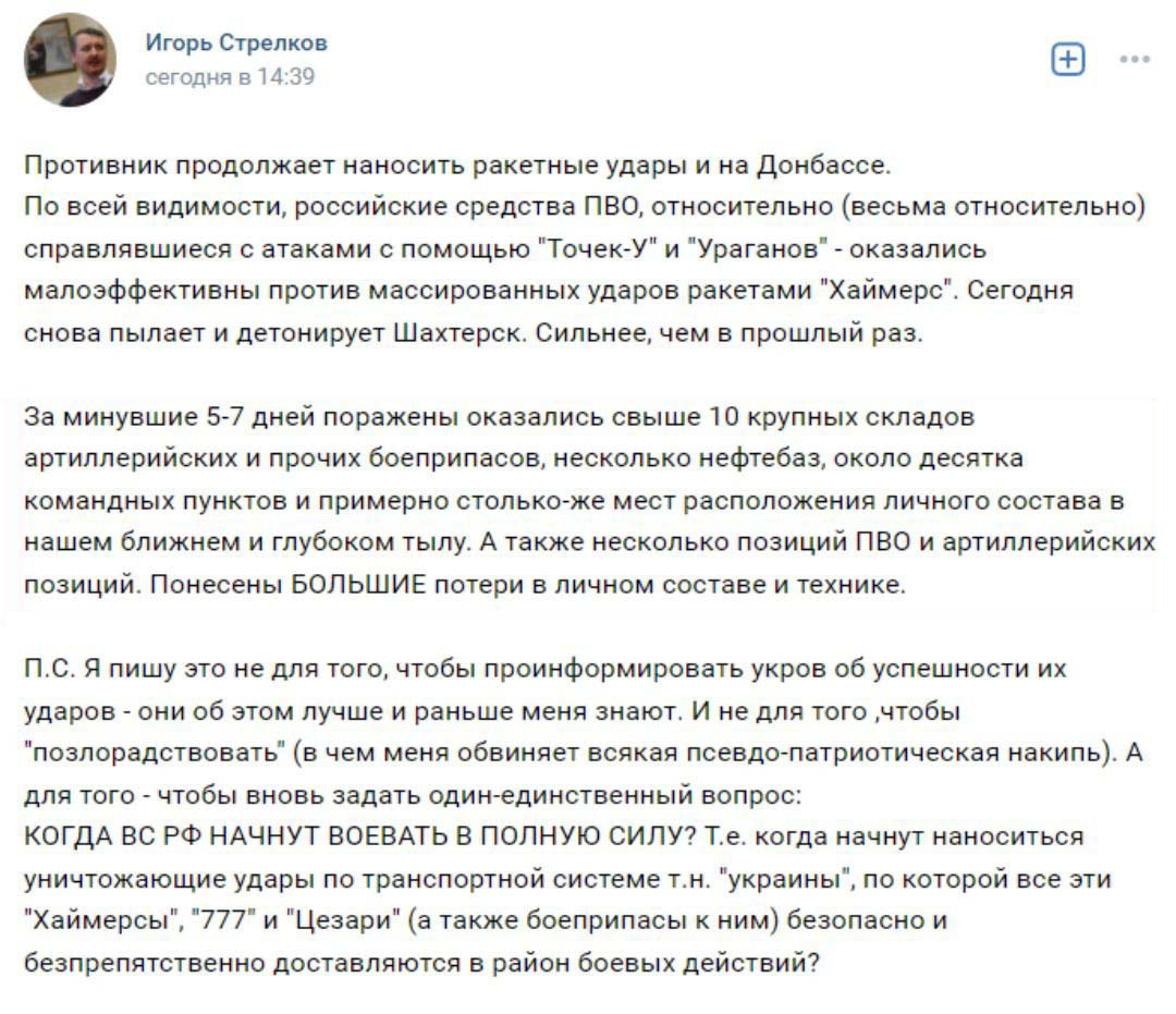 Завили гучніше, ніж зазвичай виє терорист гіркін, який з терористами у 2014 році захопив українське місто Слов’янськ. Риторика російського найманця вийшла на новий рівень: він вже чи не закликає окупантів рити собі могили, лягати в них і накриватись ганчіркою, адже «друга армія світу перетворилась на зборище тєрпіл».