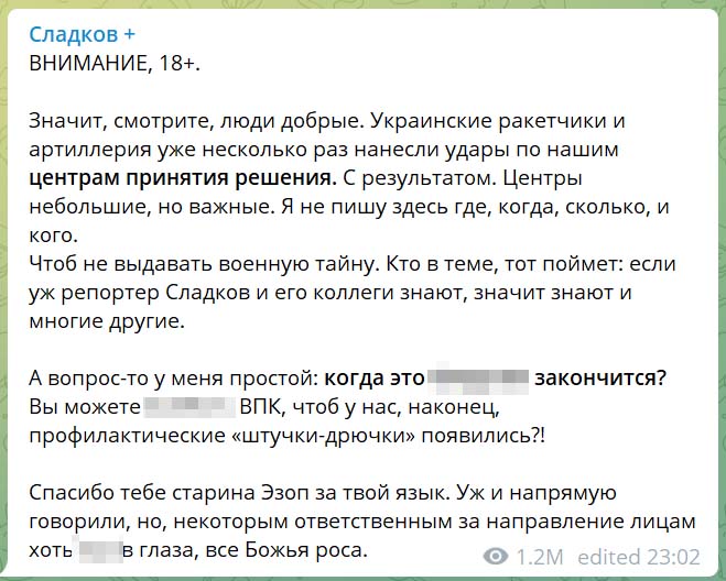 Від «зради» в рядах путіністів аж сліпить очі: орки закликають звільнити так зване керівництво (російською мовою це значить ліквідувати, як було, наприклад, ліквідовано терориста олександра захарченка), здаватись «укропам» та втікати, а іноді взагалі просто змиритися з поразкою й чекати деокупації. Причини «бавовни» російська наволоч вигадує також різноманітні, деякі з них тягнуть на Оскар — специфічний, духовний.
