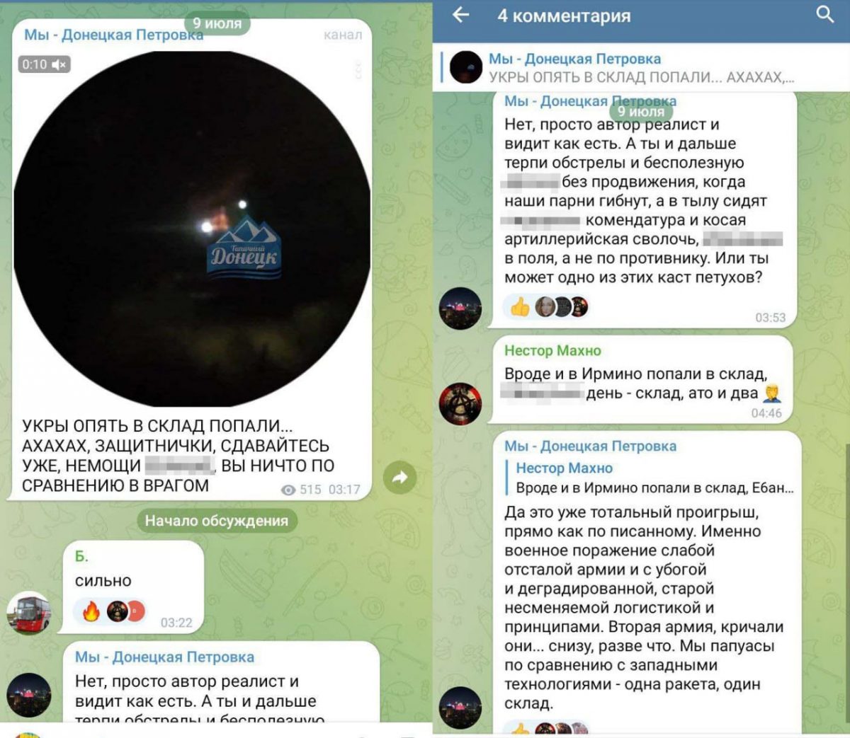 Склади з боєприпасами вибухали в Харцизьку, Іловайську, Донецьку, Макіївці, Горлівці, Кадіївці, Алчевську, Ясинуватій. Вибухи були в Херсонській і Запорізькій областях: в Чорнобаївці, Скадовську, Таврійську, Новій Каховці. Горіло яскраво, як зазвичай горять склади з ПСМ або боєприпасами. Згоріло «найголовніше з головних командувань командуваннями» окупантів на Херсонщині, про що окупанти жаліються у телефонних розмовах.