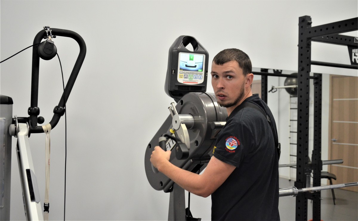 На стіні тренажерного залу помітив фото пораненого ветерана і знайшов його серед тих, хто відновлюється на тренажерах. Інтуїція підказувала, що молода людина напевно тут не перший рік проходить реабілітацію. Не помилився.