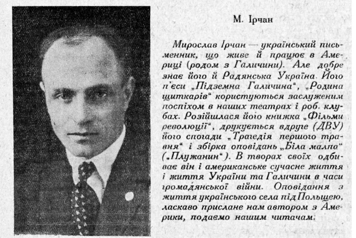 Довідково: Мирослав Ірчан (справжнє ім’я Андрій Баб’юк (1897−1937) — видатний український поет, драматург, прозаїк, публіцист, перекладач, літературознавець, кінознавець, журналіст, історик, видавець etc.