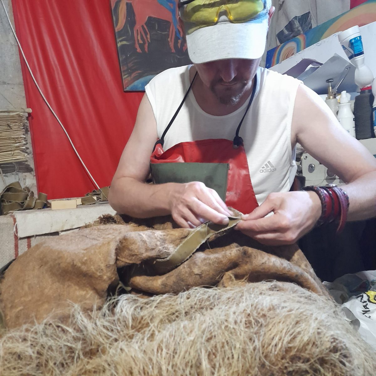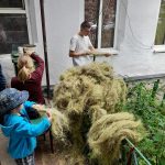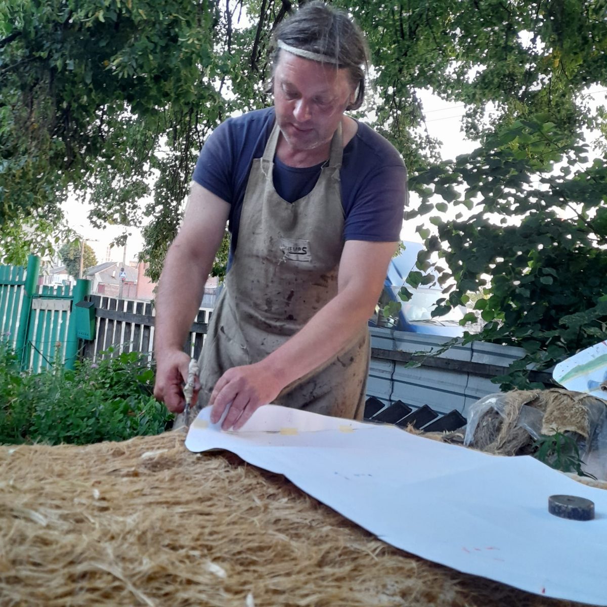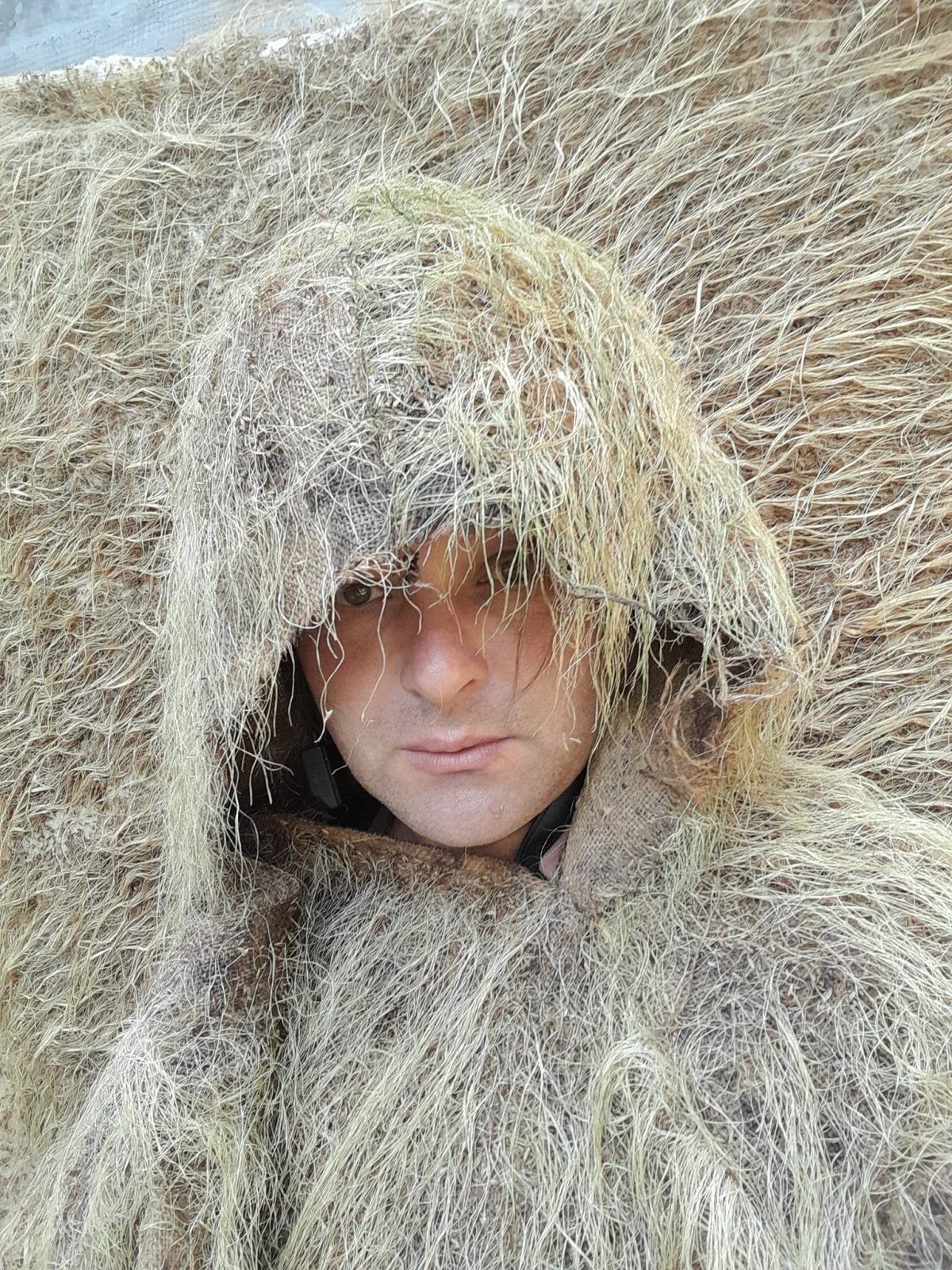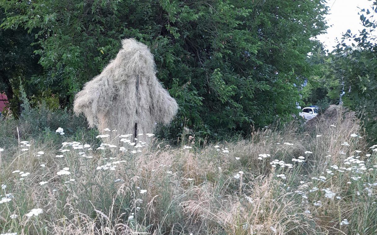 – Якесь волокно довго періодично мочимо на дощі та сушимо, щоб набуло сірого кольору, якесь випалюємо на сонці до солом’яного кольору, а якийсь зеленець тримаємо в тіні, – пояснює Олег. – Під час сушки на сонці трава вигорає, тому вже на місці кікімору можна підфарбувати штучними фарбами з балончика, щоб виріб максимально зливався з місцевістю.