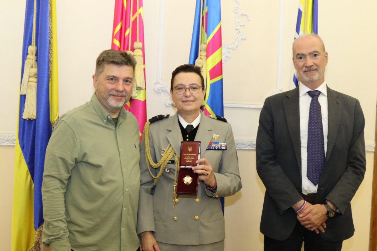 Олександр Поліщук також висловив вдячність аташе з питань оборони Франції в Україні бригадному генералу Андре Еврар з нагоди завершення дипломатичної місії в Україні та від імені Міністра оборони нагородив її відзнакою Міністерства оборони України – Знаком Пошани.