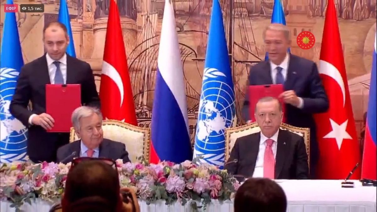 Проєкт документа був напередодні узгоджений на чотиристоронній зустрічі представників України, росії, Туреччини та ООН. У церемонії підписання взяли участь Президент Туреччини Реджеп Ердоган і Генеральний секретар ООН Антоніу Гутерріш.