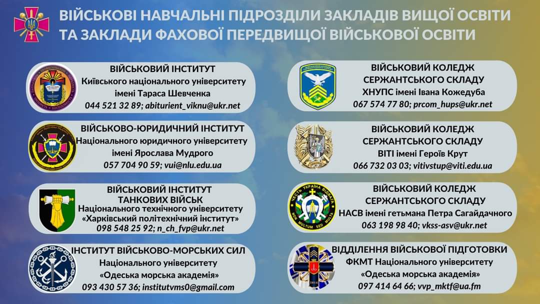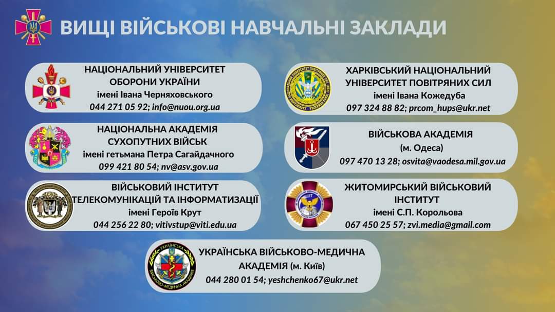 —Цьогорічна вступна кампанія в умовах широкомасштабної російської збройної агресії суттєво відрізняється від попередніх, зокрема, розмаїттям варіантів участі абітурієнтів у конкурсному відборі, спрощеним механізмом подання документів, проходженням первинного медогляду та військово-лікарської комісії. Якщо хтось не в змозі оформити особову справу вступника в територіальних центрах комплектування та соціальної підтримки за місцем проживання (перебування на обліку. — Ред.), є можливість зробити це в обраному військовому навчальному закладі — особисто або віддалено — шляхом надсилання документів засобами поштового зв’язку чи на електронну пошту, що, погодьтеся, досить зручно, — зазначив директор Департаменту військової освіти і науки Міністерства оборони України Володимир Мірненко.