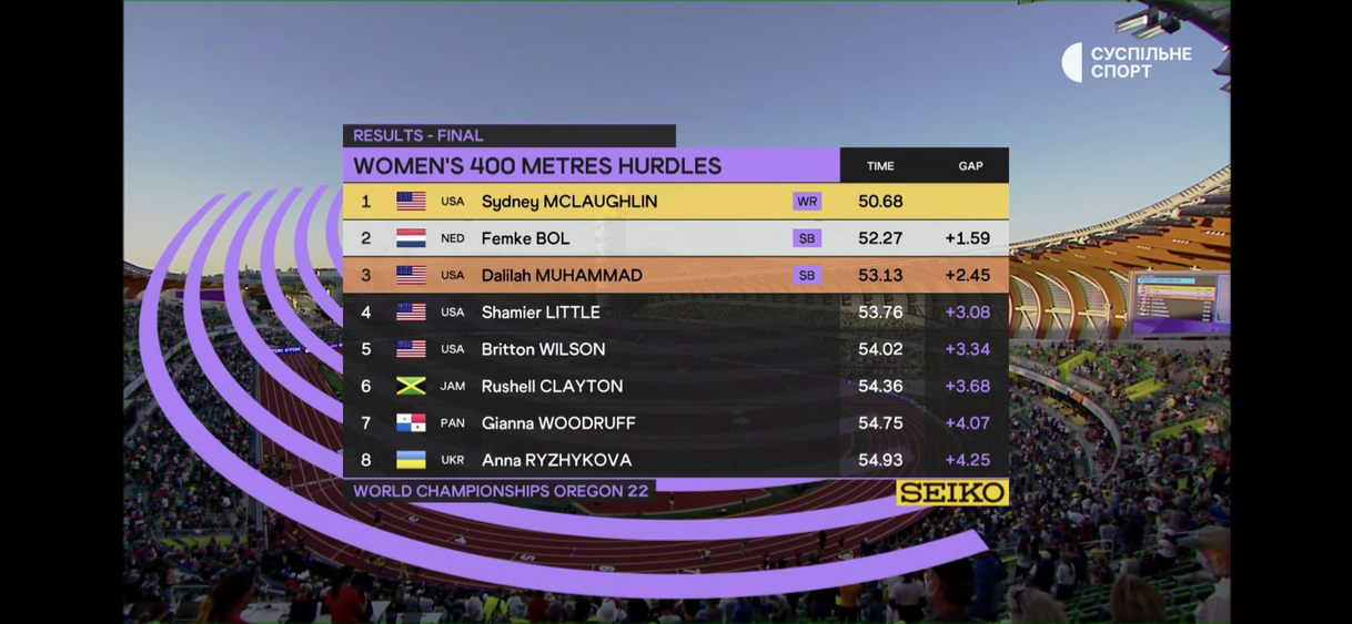 Зазначимо, під час фінального забігу американка Сідні Маклафлін встановила новий світовий рекорд на цій дистанції – 50.68 с.