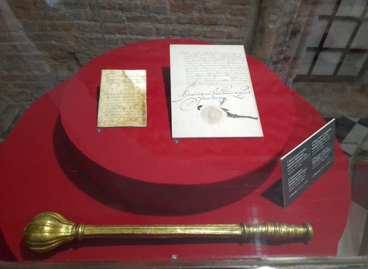 Другим важливим експонатом виставки, якщо вже виділяти їх зазначенням — а це непросто, бо кожен артефакт тут унікальний — слід, мабуть, назвати знамениту Конституцію Пилипа Орлика 1710 року. На виставці представлені репліки цього славнозвісного документа з Національного архіву Швеції та з російського державного архіву давніх актів. Конституція, до речі, представлена двома мовами, про які ми говорили — є україномовна та латиномовна її версії. До речі, саме відкриття виставки відбулося 29 червня саме до Дня Конституції України.