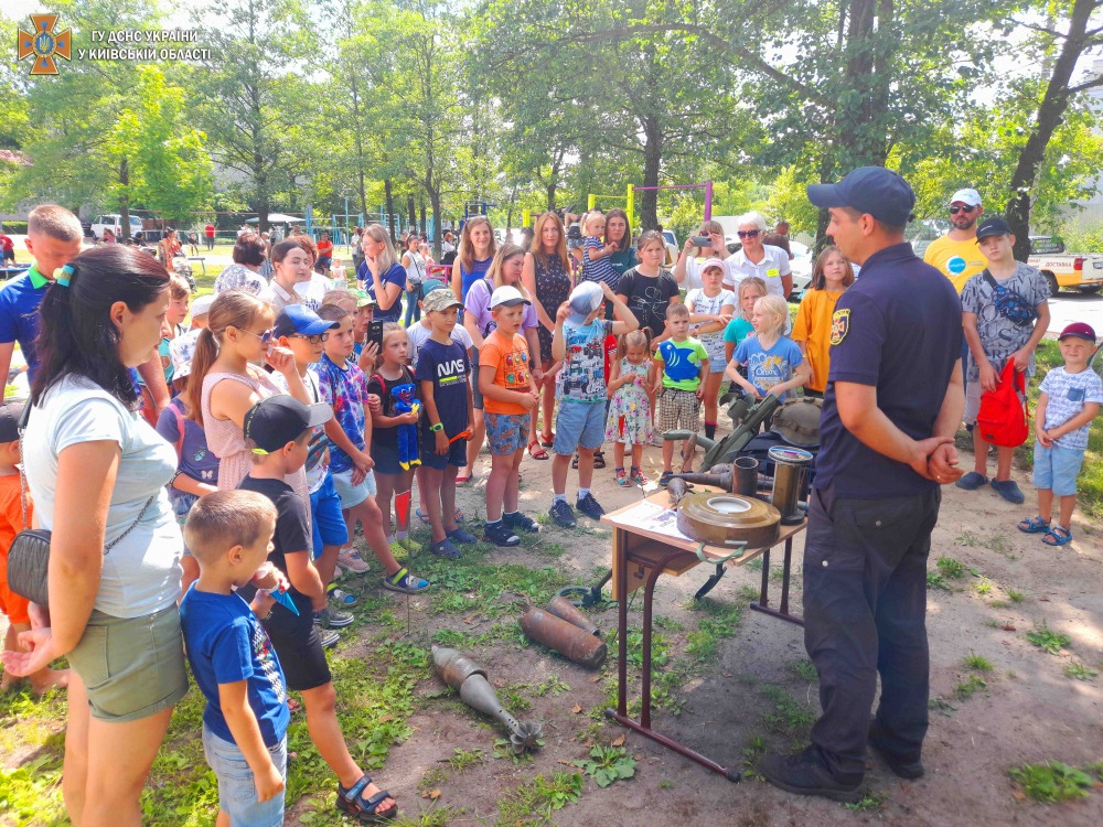 Піротехніки продемонстрували макети найпоширеніших сучасних боєприпасів та вибухових пристроїв, які позалишали на Київській області, після себе російські війська. Кожен із присутніх ознайомився із небезпечною роботою піротехніка, та приміряв важкі захисті обладунки із броні. Найцікавішим для малечі було спробувати пошук замаскованих «металевих іграшок» за допомогою саперського металошукача.