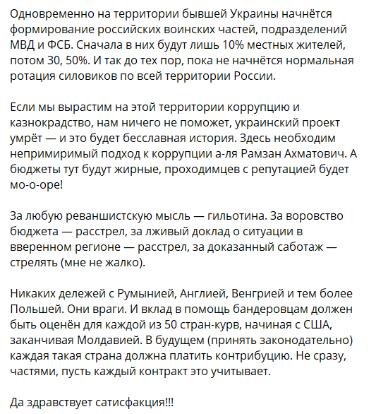 «У територіальному аспекті: вся Україна перейде до росії. Вся. Бо якщо залишити укронацистам хоч один квадратний метр, вони на ньому не хліб вирощуватимуть, а готуватимуть антиросійських диверсантів. У політичному аспекті: жодних автономних республік (тільки Донбас на це заслужив), а лише повноцінні області росії. На завойованих територіях треба поводитися завойовником, а не скромним гостем. Народ любить господарів, а не мямлів. У військовому: спочатку буде період розгрому ЗСУ та нацбанд. Керують на цьому етапі генерали Міноборони. Другий період — розшук і нейтралізація ватажків, розгром банд і підпілля. В цей час керуватиме фсб. Третій період — повне припинення силового опору залишків укронацистів. Цей період за росгвардією», – висловився пропагандист сладков.