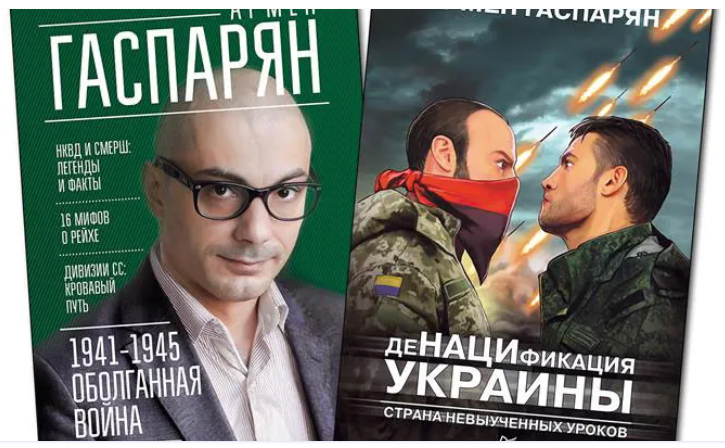 армен гаспарян − російський пропагандист, який неодноразово публічно закликав до знищення українського народу. Зокрема, в опублікованій 2018 року книзі «Денацификация Украины. Страна невыученных уроков», гаспарян вперше на системному рівні вдався до використання терміну «денацифікація» і закликав військово-політичне керівництво росії розпочати широкомасштабну збройну агресію проти українського народу і держави Україна.