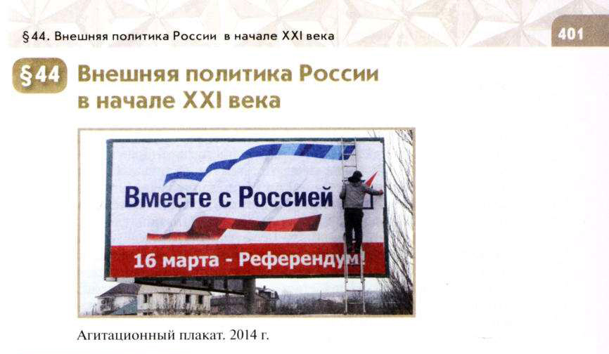 Ключовим у цьому плані є написаний арменом гаспаряном і проілюстрований агітаційним біґбордом про незаконний референдум у Криму 16 березня 2014 року § 44 «Внешняя политика России в начале ХХІ века». Тон параграфу задає вже його перший пункт під назвою «В. В. Путин и смена ориентиров российской внешней политики». З нього учень може дізнатися, що впродовж 1990-х років російська федерація добровільно притримується «послідовного самостійного зовнішньополітичного курсу», що призвело до падіння її авторитету на міжнародній арені та перетворення країни на слухняного молодшого партнера країн ЄС та США, а також місце «приложения капитала, рынок сбыта и сырьевой придаток».