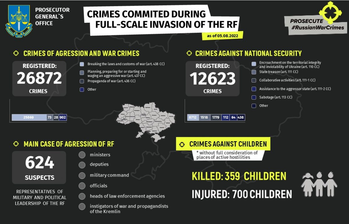 «Станом на 5 серпня задокументовано 26 872 воєнні злочини та 12 623 злочини проти національної безпеки України. За офіційними даними ювенальних прокурорів 1059 дітей постраждали в Україні внаслідок збройного вторгнення рф в нашу державу. При цьому 359 дітей загинуло та 700 отримали поранення», — повідомляють в Офісі Генерального прокурора.