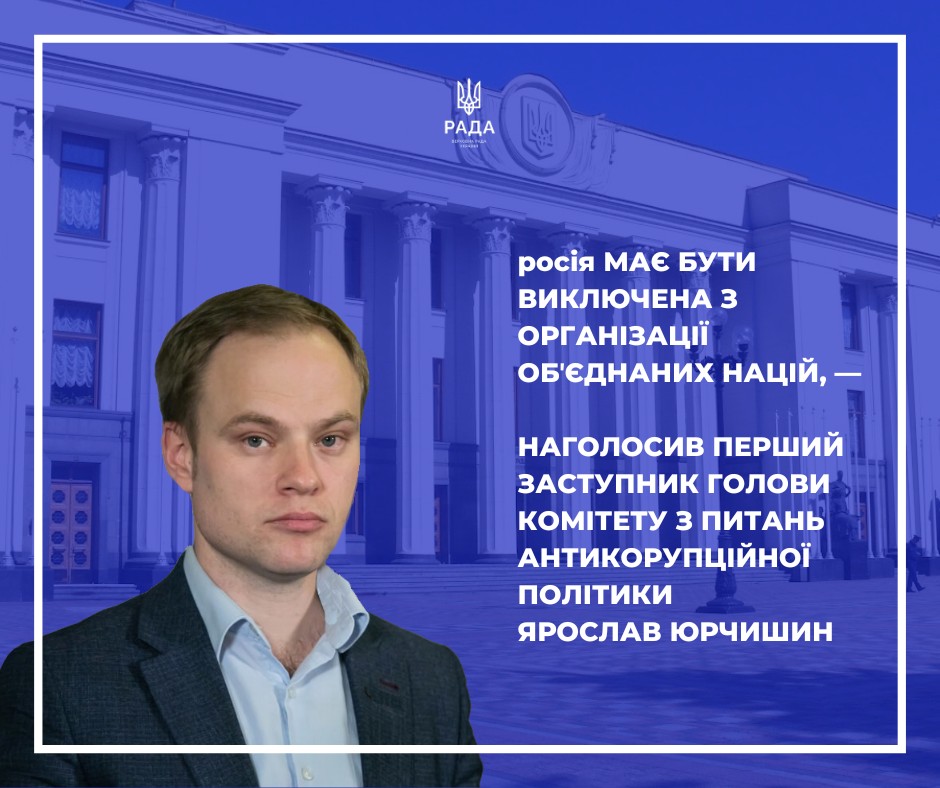 Перший заступник Голови Комітету Верховної Ради України з питань антикорупційної політики Ярослав Юрчишин закликав ООН виключити росію з лав організації через агресію проти України. Про це повідомляє пресслужба Верховної Ради України.