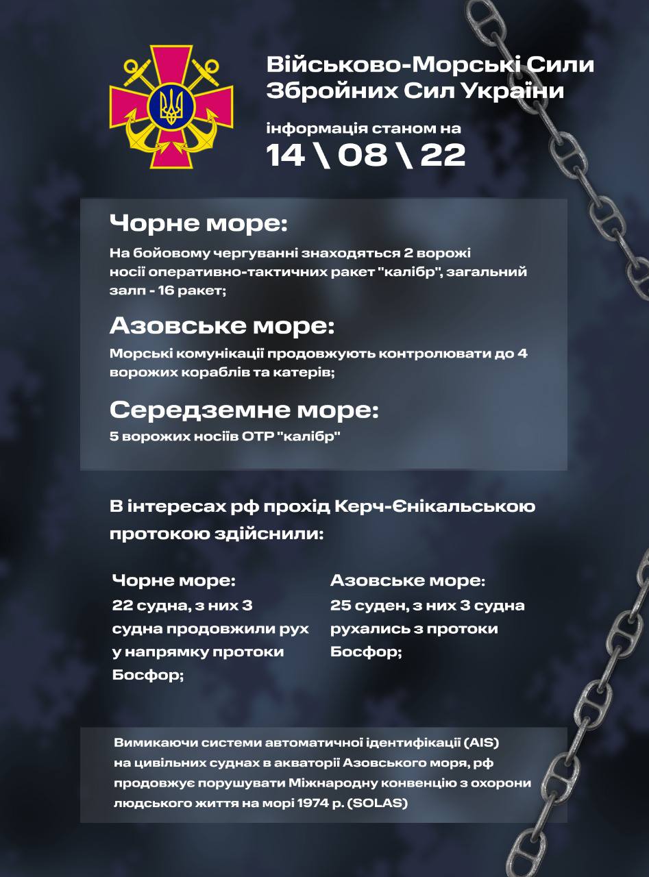 За добу, в інтересах рф прохід Керч-Єнікальською протокою здійснили до Азовського моря – 25 суден, з них 3 судна здійснювали рух з протоки Босфор; до Чорного моря – 22 судна, з них 3 судна продовжили рух у напрямку протоки Босфор.