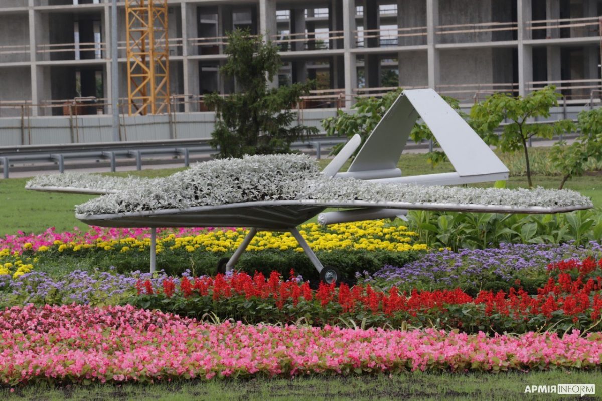 − Нині для нашого населення потрібен монумент, що підніме настрій та дух. Ми розглядали різні варіанти, але вирішили, що яскравим символом протистояння України агресору є саме «Байрактар». Корпус безпілотника повністю виконаний зі вторинних матеріалів, які пройшли переробку. А квіткове панно викладено в основному з агератуму, чорнобривців, сальвій, пивоній, петуній та хризантем, − розповідає дизайнер комунального підприємства по утриманню зелених насаджень Оболонського району Дмитро Гаврилюк.