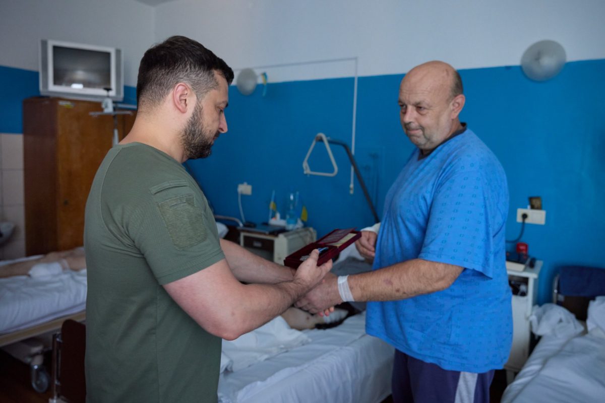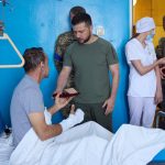 Президент України Володимир Зеленський під час робочої поїздки на Львівщину відвідав військовослужбовців, поранених під час бойових дій, які проходять лікування в одному з медичних закладів міста.