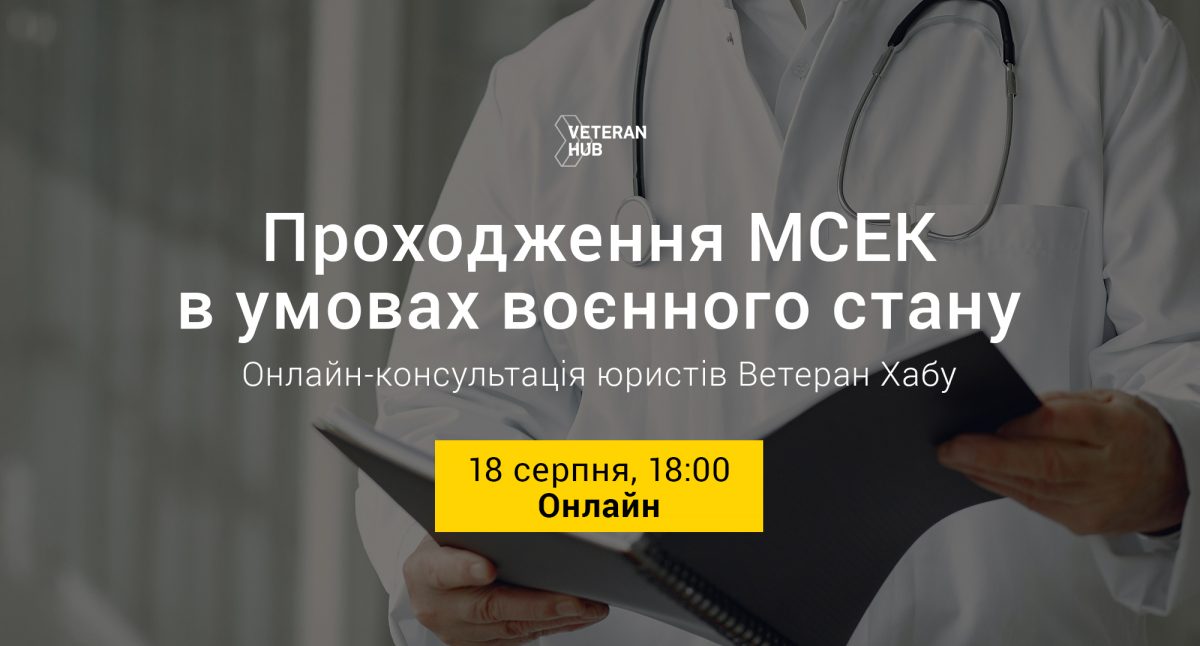 Відповіді на це та багато інших запитань, що виникають під час проходження медико-соціальної експертної комісії в період воєнного стану, можна отримати сьогодні, 18 серпня, на онлайн-консультації від Veteran Hub. Зустріч проводитимуть юристи організації Тетяна Вакула та Микола Тимощук. Формат події — онлайн-лекція та сесія запитань-відповідей наприкінці.