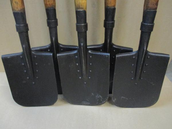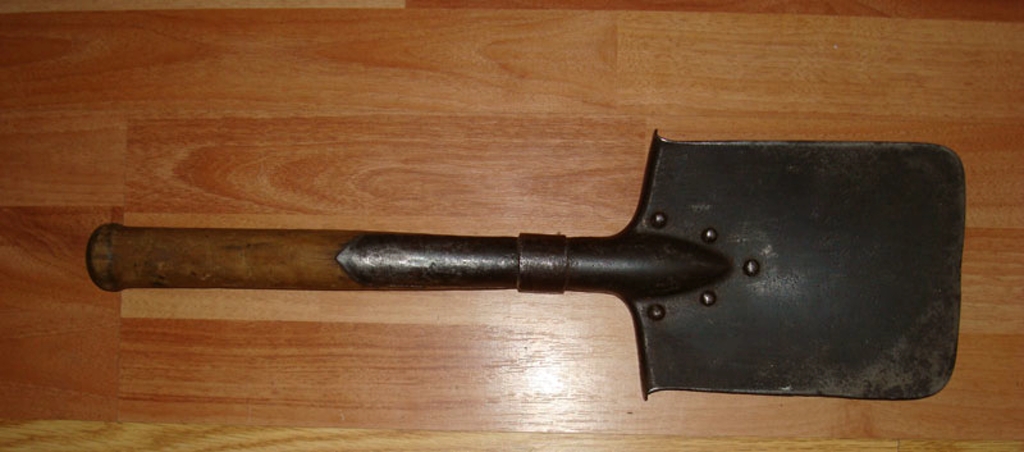 4. «Три ялинки» – найбільш «молодий» різновид піхотних лопаток, що трапляються на складах. Така назва через клеймо виробника. П’ятикутне лезо з одним отвором у основі для фіксації руків’я шурупчиком. Це ті, що були випущені радянським ВПК після 1980-х років. І якщо казати про якість, То, напевно, ці – найгірші з усіх вищеперерахованих. Адже і якість металу, і якість дерева для руків’я спонукає бажати кращого. Ну а виготовлялося лезо такої лопати методом холодного штампування.